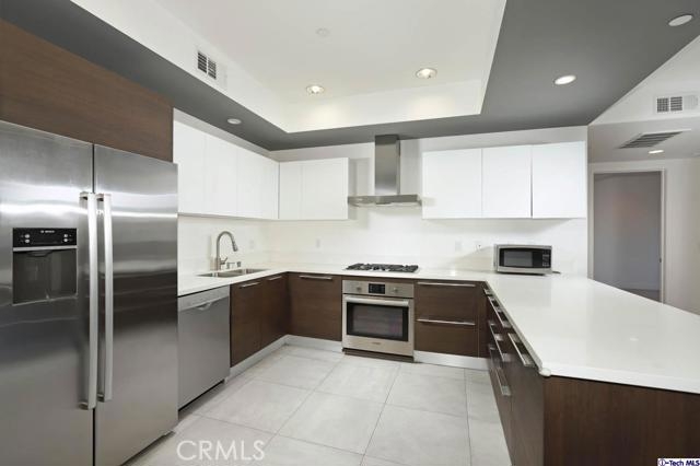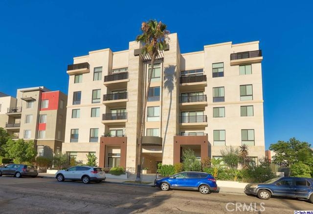 Rare Corner Unit, Newer Construction, w/ Prime Glendale Location, walking distance to The Americana and Glendale Galleria. Modern luxury living in one of the most highly coveted buildings in the heart of downtown Glendale. Designed for livability and entertaining this gorgeous unit boasts an open floorplan with well-appointed designer details including high ceilings modern recessed lighting, and oversized doors and windows and chic light-colored wood flooring, and a railed balcony. The stylish kitchen features include beautiful quartz countertops, well-made cabinetry with self-closing drawers, a dining bar, and high-end stainless steel BOSCH appliances. The inviting bedroom includes a spacious walk-in closet. The bathroom features a luxurious soaking tub with a seat, a lavish walk-in frameless shower with designer surfaces and fixtures, and a tile floor. Corner unit shares one wall maintaining additional owner privacy. The laundry closet includes a newer bright white stackable LG washer & dryer. The building offers secure, subterranean parking with 2 assigned parking spaces and storage unit w/ low HOA. The inviting clean lobby, impeccable grounds including a serene outdoor seating area are clean and well maintained. Located on a quiet street at Kenwood and Broadway and within walking distance to the popular shops of The Americana and the Glendale Galleria.