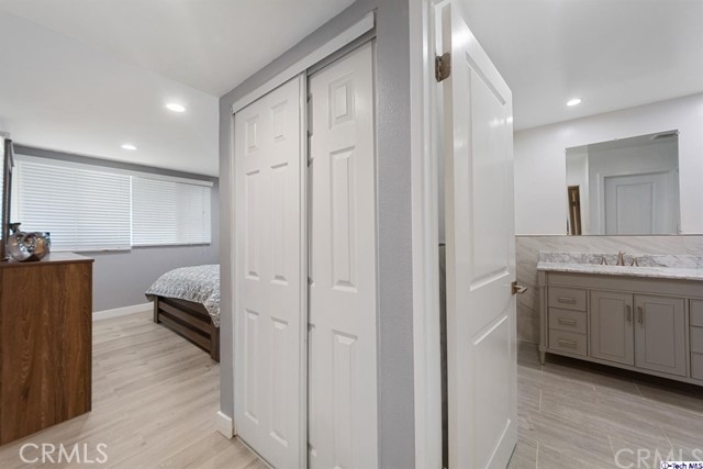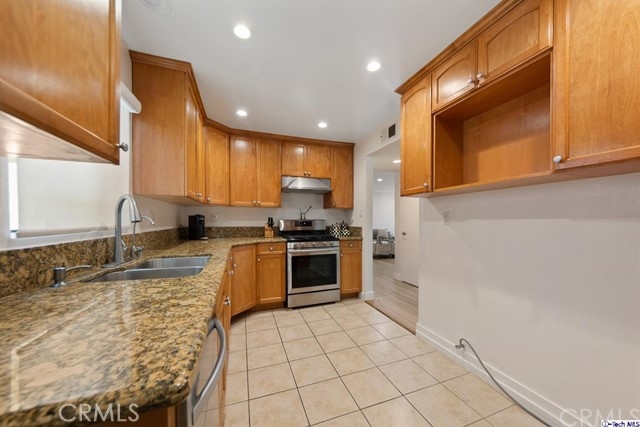 Newly remodeled single story condo located in a prime location in red hot Glendale. This desirable unit is within minutes to the Americana, Glendale Galleria and downtown Glendale where you will find shopping, restaurants & entertainment. Centrally located just off the 134 and 5 fwys, it is in close proximity to downtown Los Angeles, Burbank and the San Fernando Valley and the westside. This beautiful unit is located on the first floor of a well maintained building and has an oversized outdoor balcony, great for outdoor entertaining. The unit consists of 2 nicely sized bedrooms and one full bath along with a second 1/4 bath with only a sink and separate entrance for guests. There is space to possibly add a second toilet with the approval of the HOA and city in the second bathroom. Some of updated features include recessed lighting, new flooring, newer central air and heat, spacious kitchen with granite countertops and stainless steel appliances. There is a separate washer/dryer area inside the unit. Subterranean private parking has 2 side by side spaces with storage. Why rent when you can own? This unit is priced to sell!