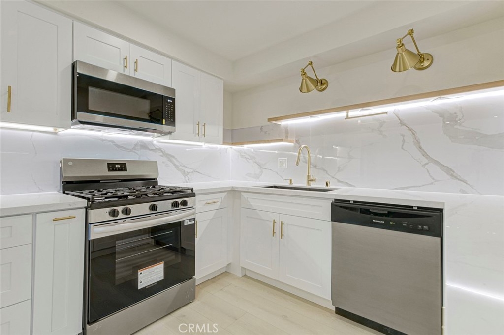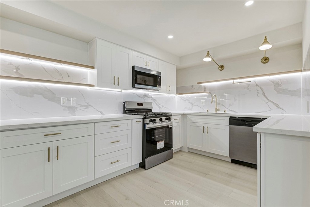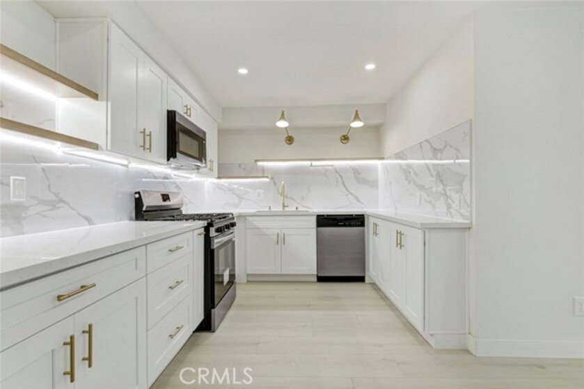 Fully renovated corner, one-level 2-bedroom, 2-bath condo in a prime location in Glendale! Smooth ceilings (popcorn removed), recessed lighting, wide-plank flooring, and a bright neutral palette create an open and comfortable living space. The living room is spacious and filled with natural light, opening to a private balcony with open mountain views and an elevated outlook toward the 134 freeway corridor. With quality windows in place, interior noise impact is minimal, while the elevated exposure provides openness, views, and natural light. As a corner unit, the home also benefits from added privacy compared to interior units. The kitchen has been completely updated with white shaker cabinetry, quartz countertops, a full-height designer backsplash, under-cabinet lighting, and stainless steel appliances. Both bathrooms feature modern vanities, illuminated mirrors, contemporary fixtures, and updated designer finishes. Bedrooms are well-proportioned with good natural light and flexible use. Additional highlights include central air and heat, elevator access, two side-by-side parking spaces conveniently located near the elevator, a secured lobby, and a community pool. While the unit does not have in-unit laundry, the on-site laundry room is located very close to the unit and offers multiple washers and dryers operated via mobile app, providing a convenient and efficient setup. The well-maintained community has also seen recent improvements, including new floors on hallways, a resurfaced pool, recreation/media room, and a newer roof. Plenty of street parking available. Well located in Glendale, close to shopping, dining, and with easy access to the 134 freeway. A strong opportunity to own a renovated, corner-unit condo in a well-maintained building.